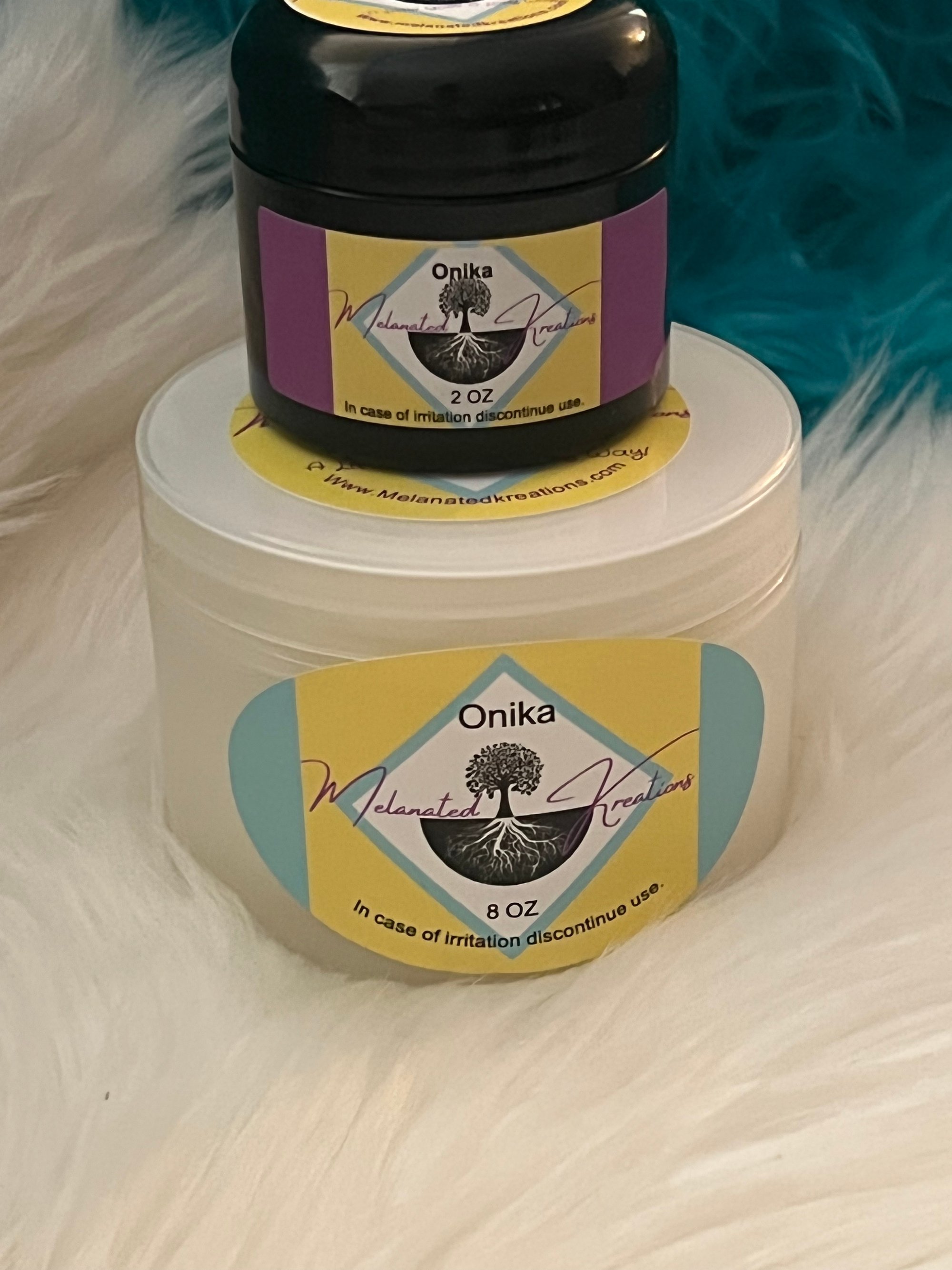 Smooth, creamy and long lasting. Natural ingredients like Unrefined Shea butter, Aloe Vera butter and body safe fragrance oil. Available in 2 Oz and 8 Oz jars.